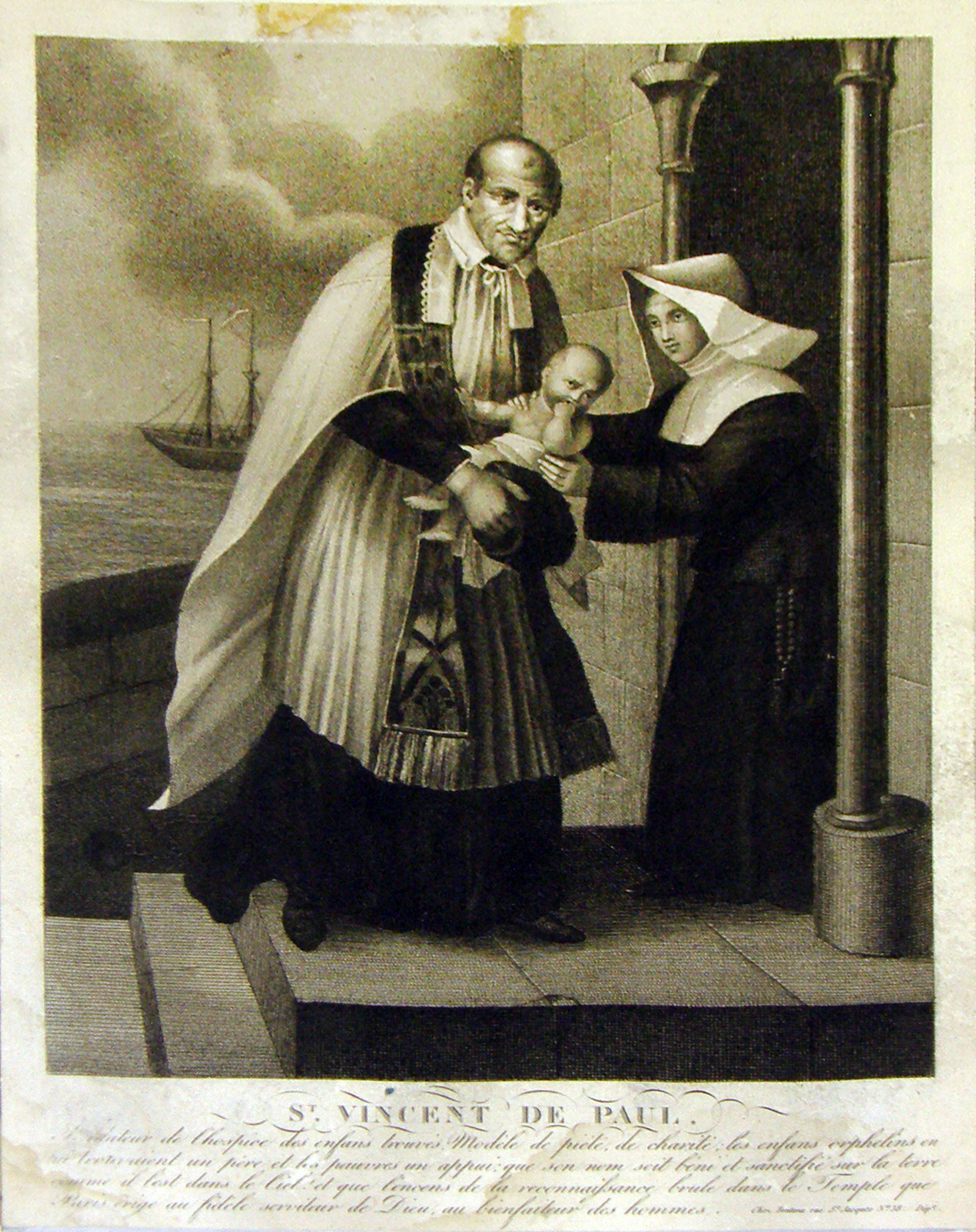 Vincent de Paul, cassock, surplice, stole, bring child to a Sister; ship in background; French text; original in CM archives, Paris