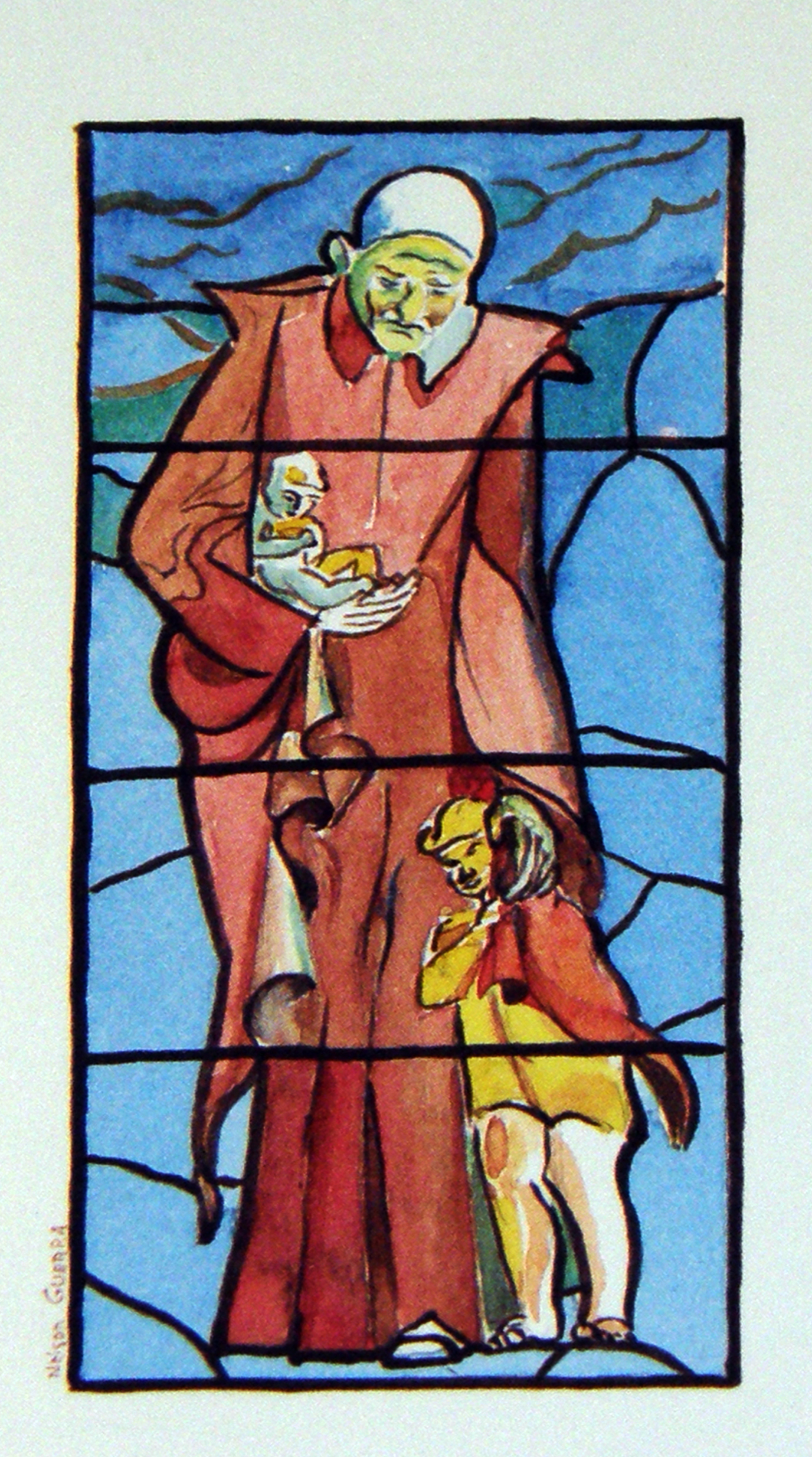 Vincent de Paul, two children, watercolor, signed Nelson Guerra; original in CM archives, Paris
