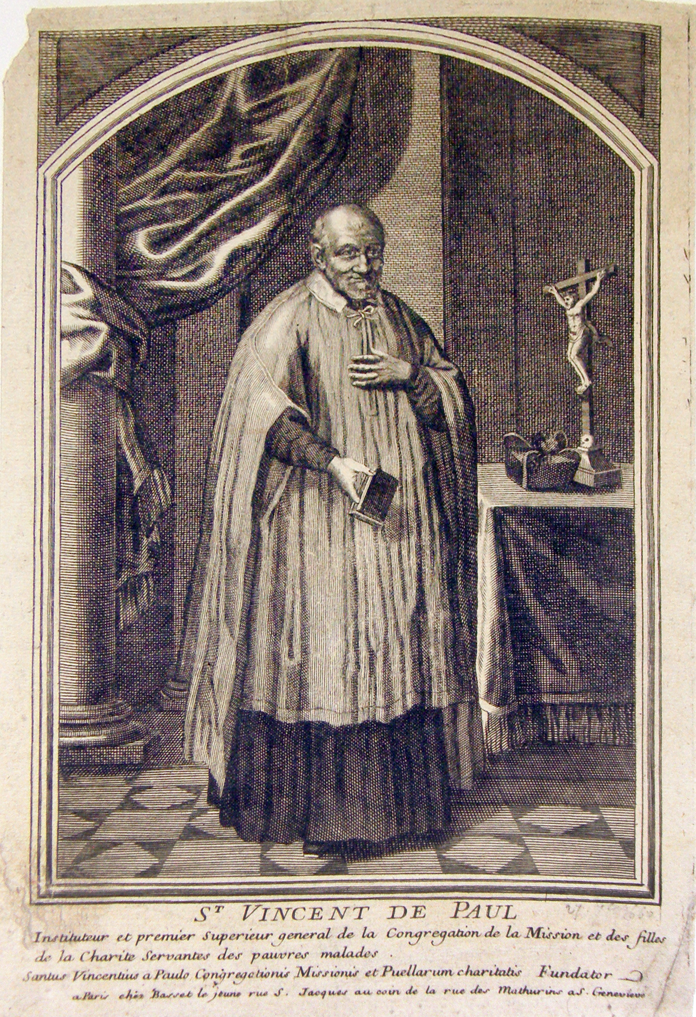 Vincent de Paul, standing, cassock, surplice, holding book (of rules); birretta on table; text in French, Latin; original in CM archives, Paris