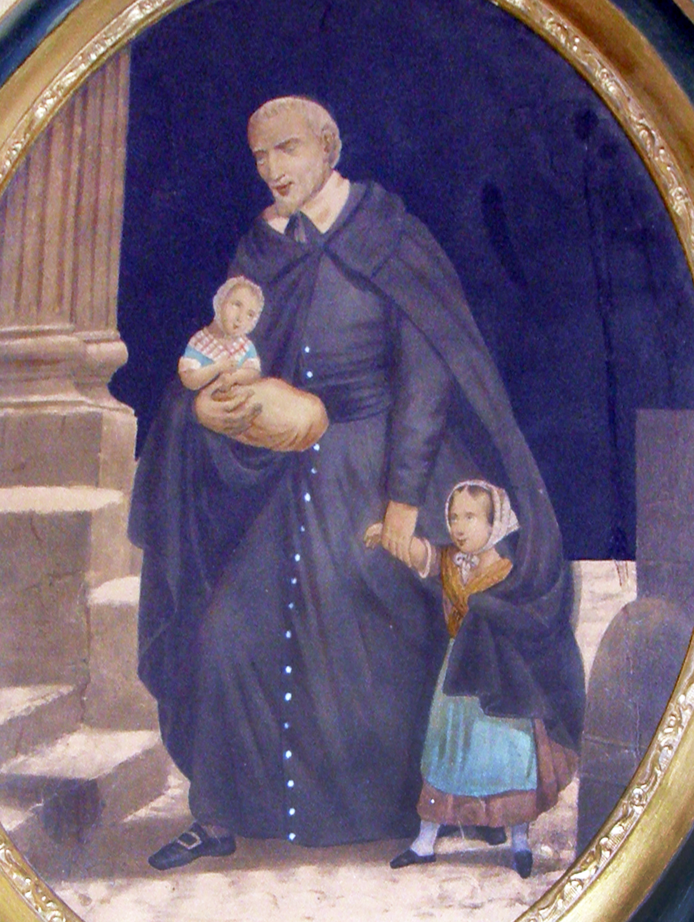 Vincent de Paul, with two children; holds loaf of bread; no skullcap
