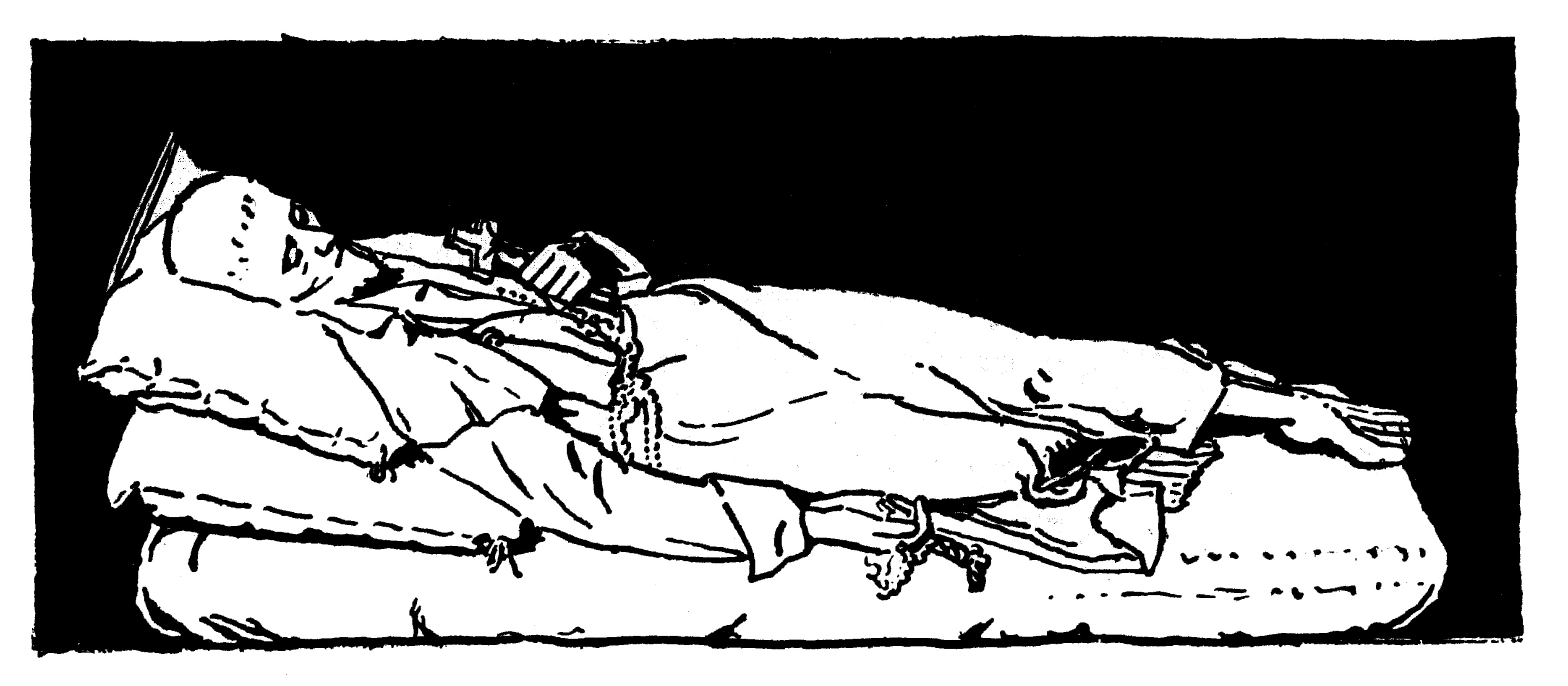 Vincent de Paul, supine; in cassock, no shoes or skullcap, holding rosary, crucifix; idealized drawing of his remains in reliquary; artist unknown