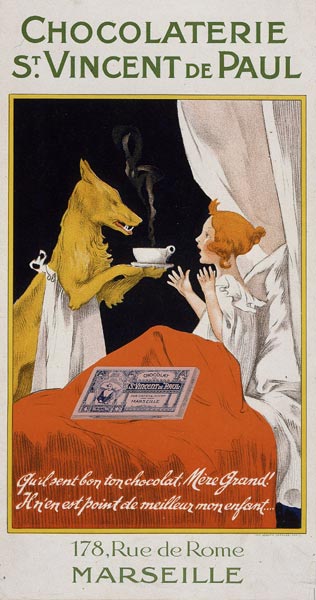Based on Little Red Riding Hood; French text: How good your chocolate smells, grandmother; there is no better, my child. Wrapped package of chocolate with image of a Daughter of Charity.