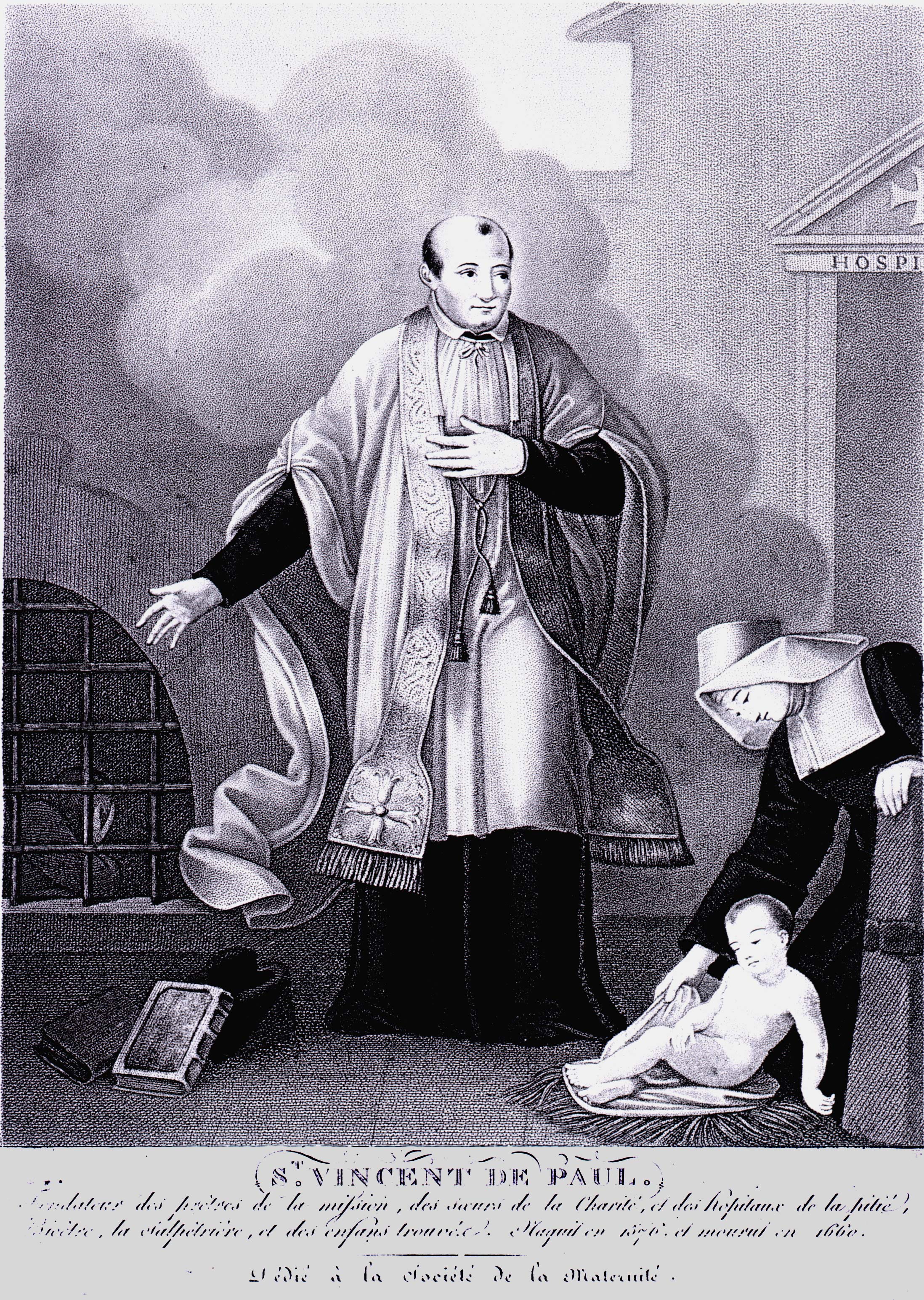 Engraving, Vincent de Paul, standing, cassock, ample surplice, stole; Daughter of Charity reaching to help infant; books and biretta on the ground. Dedicated to Motherhood Society.