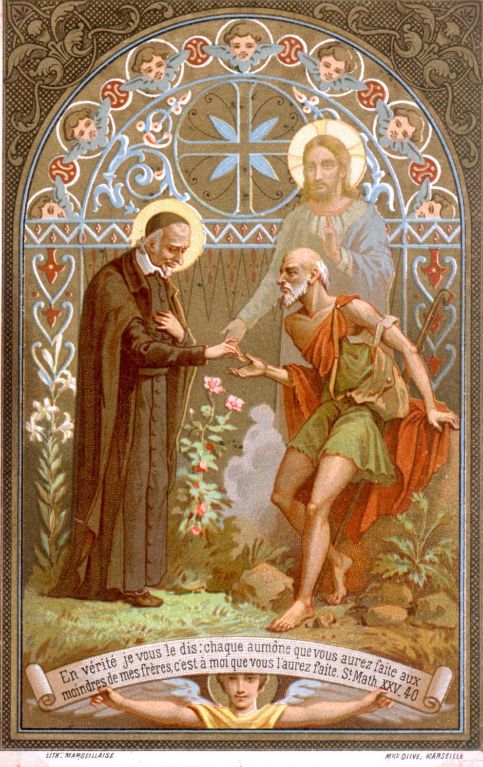 Vincent de Paul, standing, cassock, cincture, cape, skullcap, halo; giving alms; citation in French, Matt 25:40; printed in Marseilles