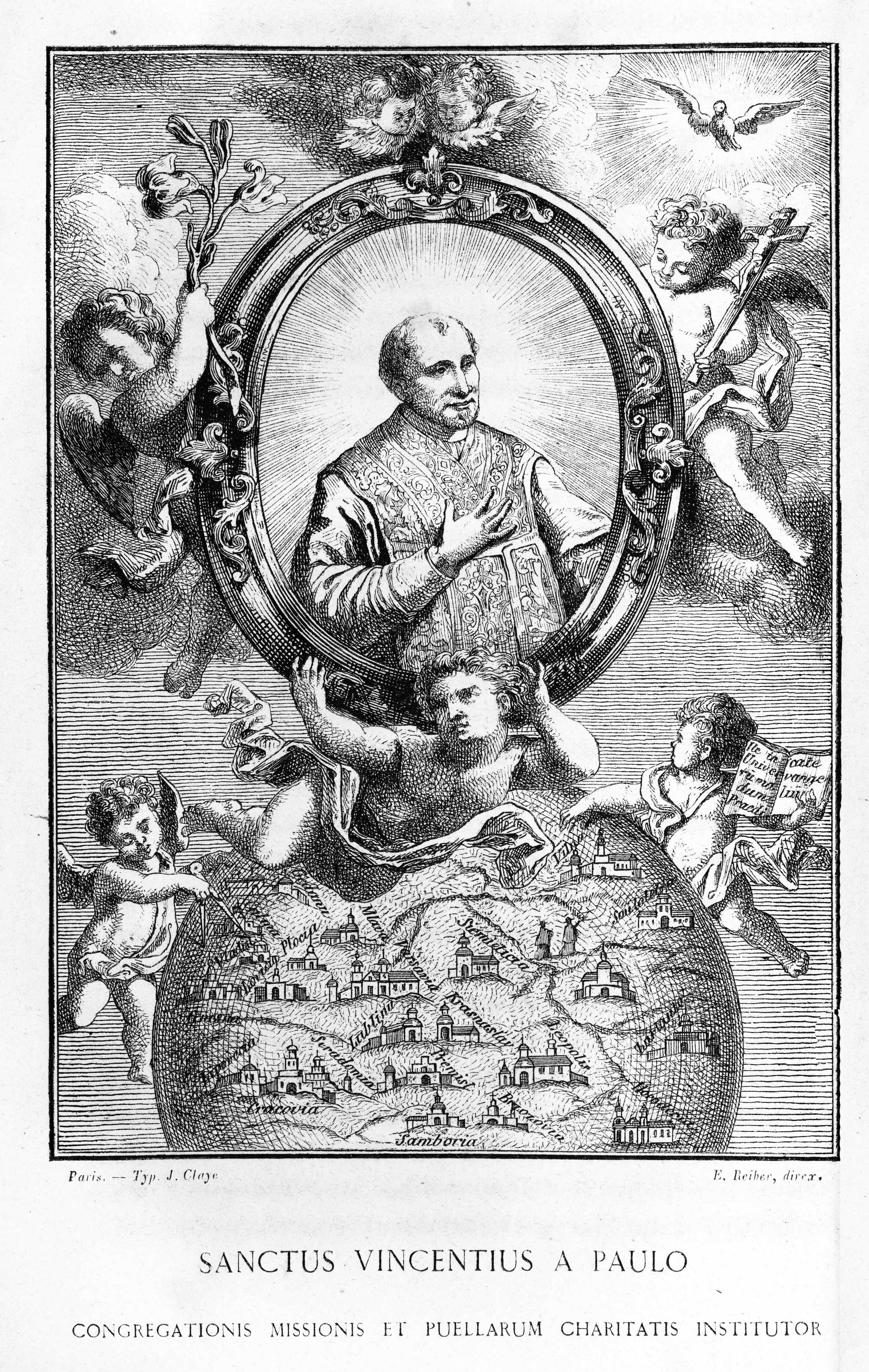 Vincent de Paul in priestly vestments, in oval held by angels; dove of the Holy Spirit; Latin text in book: Go into the whole world to preach the Gospel; two priests on a road; Latin caption: founder of the CM and Daughters of Charity; in Memoires, 1863
