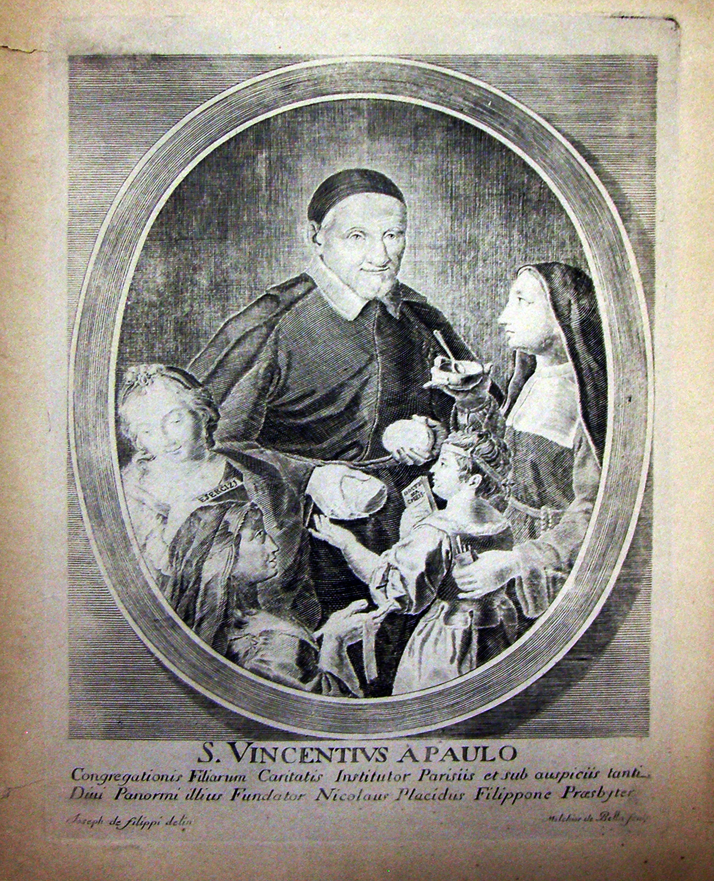 Vincent de Paul, holding bread for poor; with Sisters, woman, poor girl; Original in archives, CM mother house, Paris