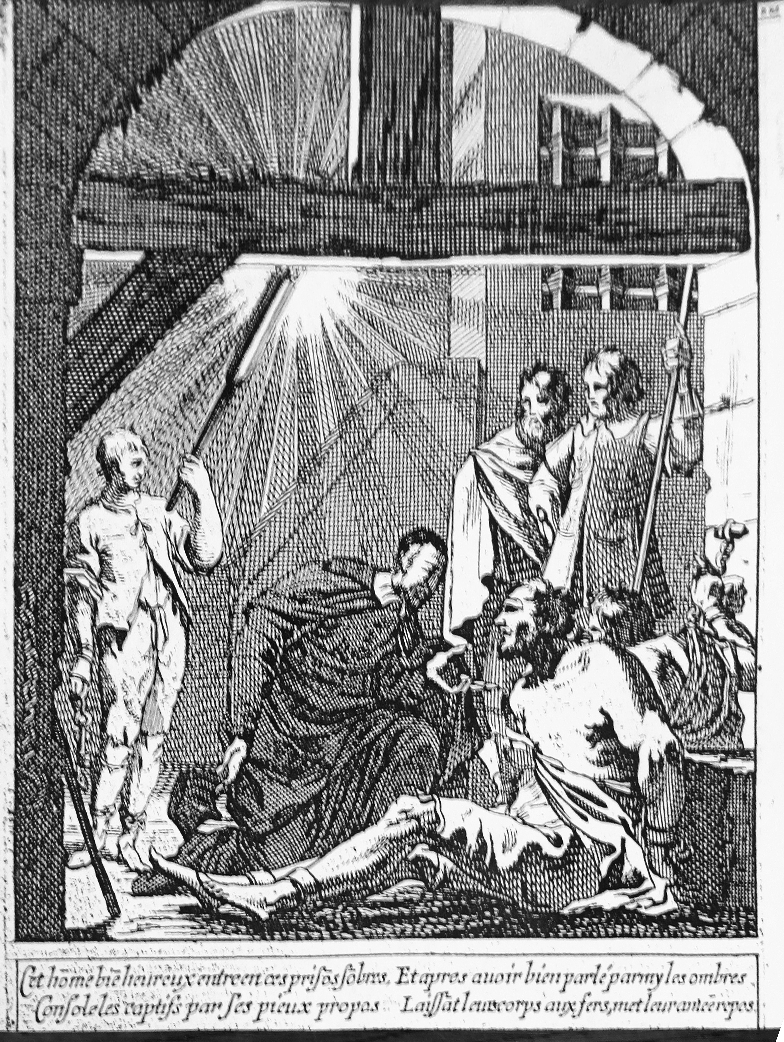 Chalumeau collection, Paris, Vincentian archives Text: This most blessed man enters these somber prisons, consoles the inmates by his pious proposals, and after talking amid the shadows, leaves their bodies in irons and brings them other food