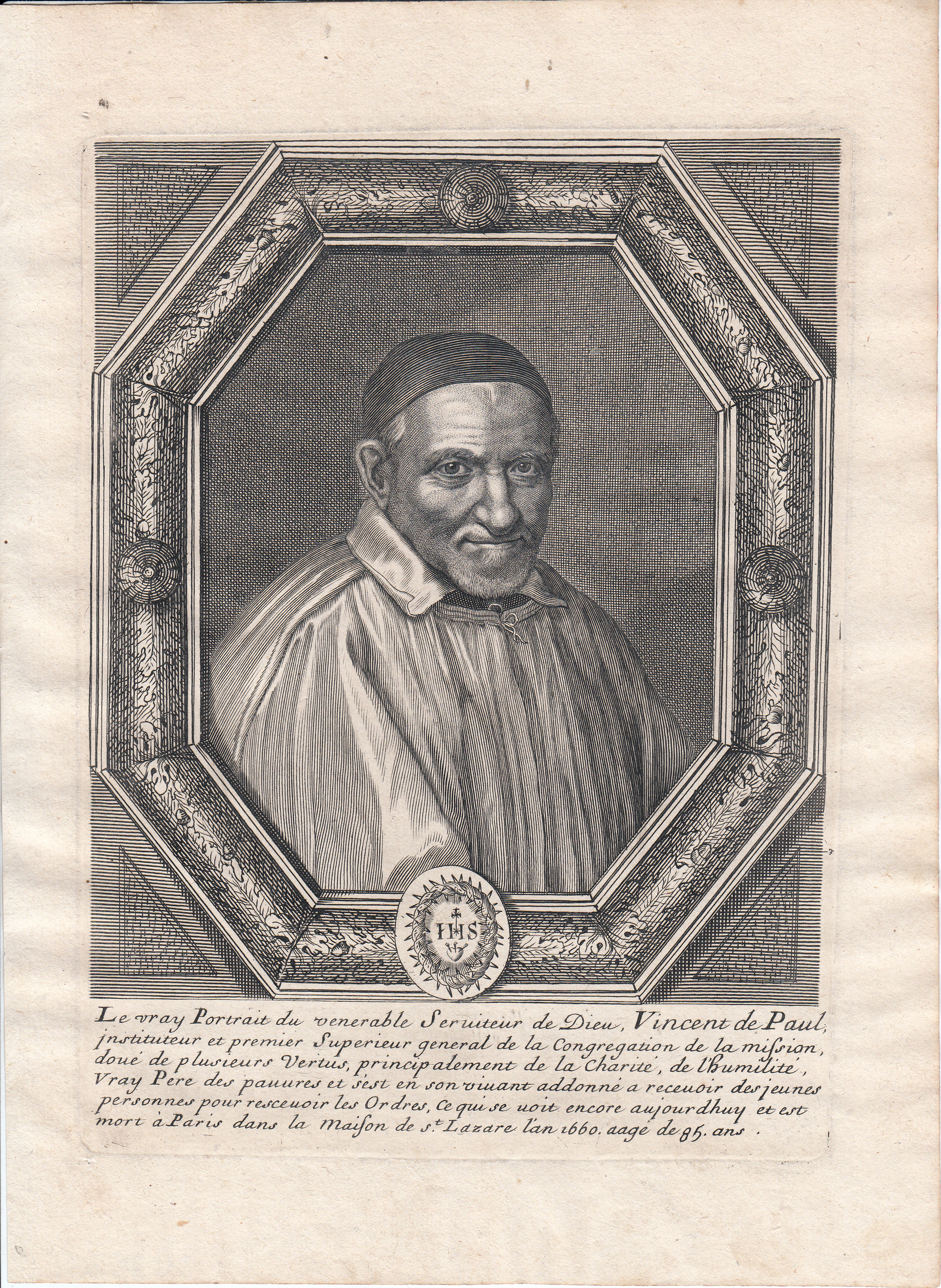 Text: ...endowed with numerous virtues, esp. charity, humility, true father of the poor, dedicated during his life to receiving young persons to receive Holy Orders, still done. Died Paris, St. Lazare, in 1660, aged 85. DPU collection