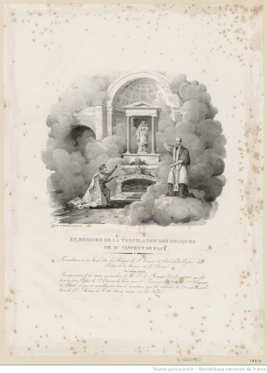 Text: Statue honored by St. Francis de Sales and SVdP; moved to the shrine of the Hospital Sisters of St. Thomas of Ville-Neuve also in rue de Sevres.