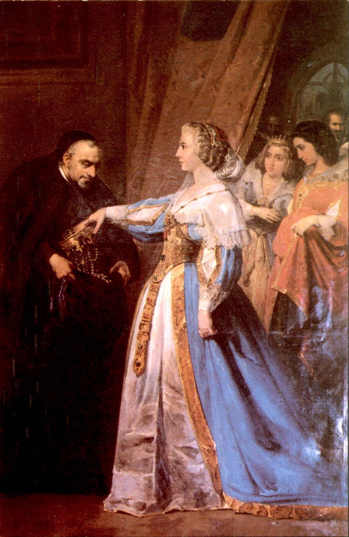 Oil painting; Anne of Austria, Spanish born queen of France, gives crown and jewels to Vincent de Paul for poor; ladies behind her; artist, JM Rodríguez de Losada; 1891, original Vincentian provincial house, Madrid