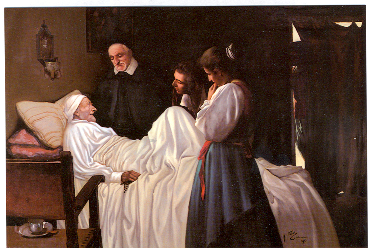 Oil on canvas; Vincent de Paul, standing, cassock, mantle, skullcap, at a man's sickbed; other figures; artist, Antonio Fillol Granell, 1895; original, Daughters of Charity, Zaragoza