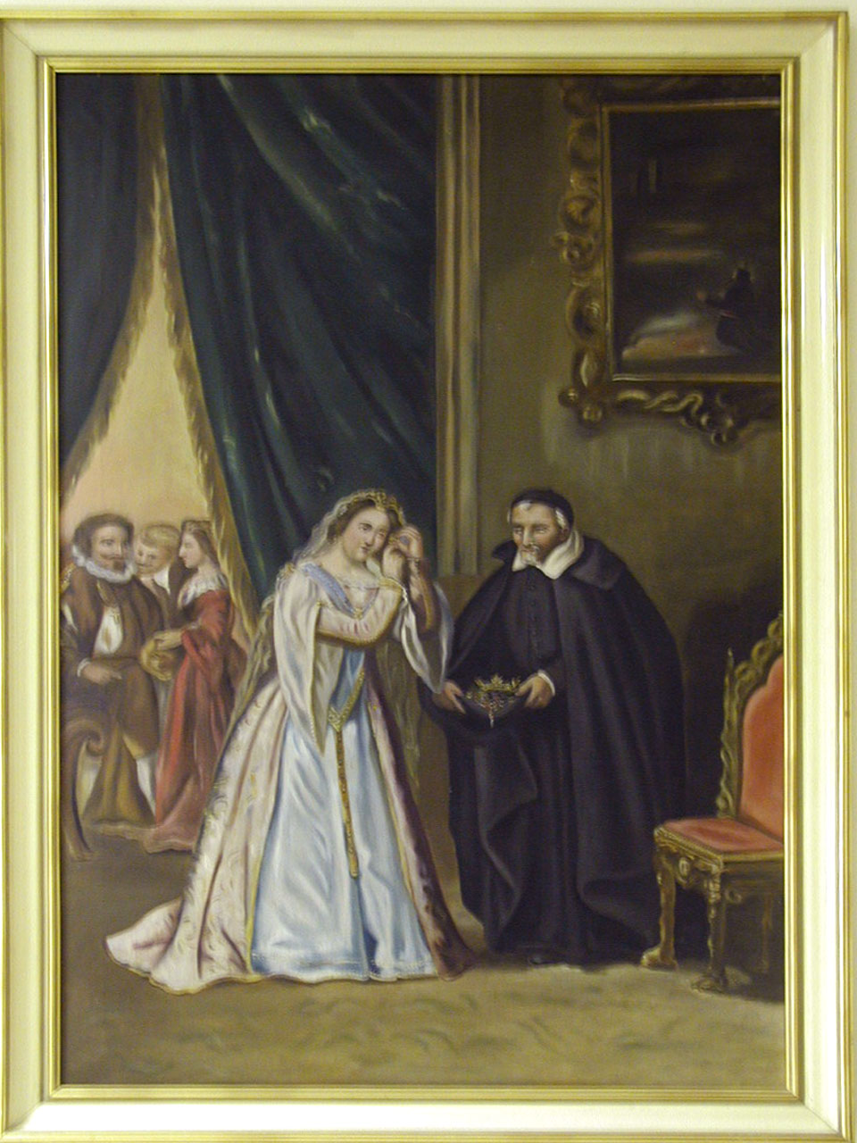 Framed oil painting; VdP, cassock, cape, skullcap, holding begging bag; Anne of Austria, queen regent, gives him valuable earrings for poor; original in Vincentian provincial house, Madrid; unknown artist