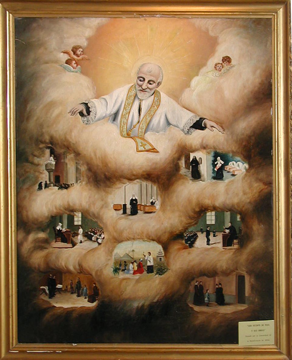 Framed oil painting; Vincent de Paul blesses works from heaven; derived from Madrid original; Daughters of Charity and Vincentians below; original in Daughters of Charity provincial house, Zaragoza