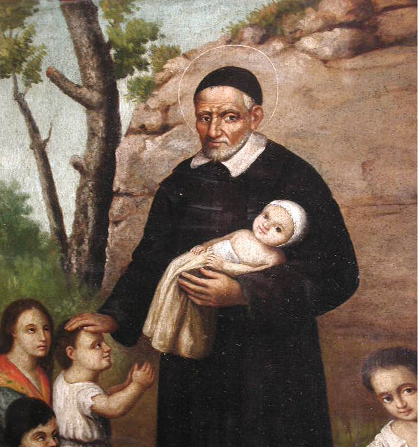 Detail of oil painting; Vincent de Paul blesses child, holding a child in his arms; original in Daughters of Charity provincial house, Zaragoza