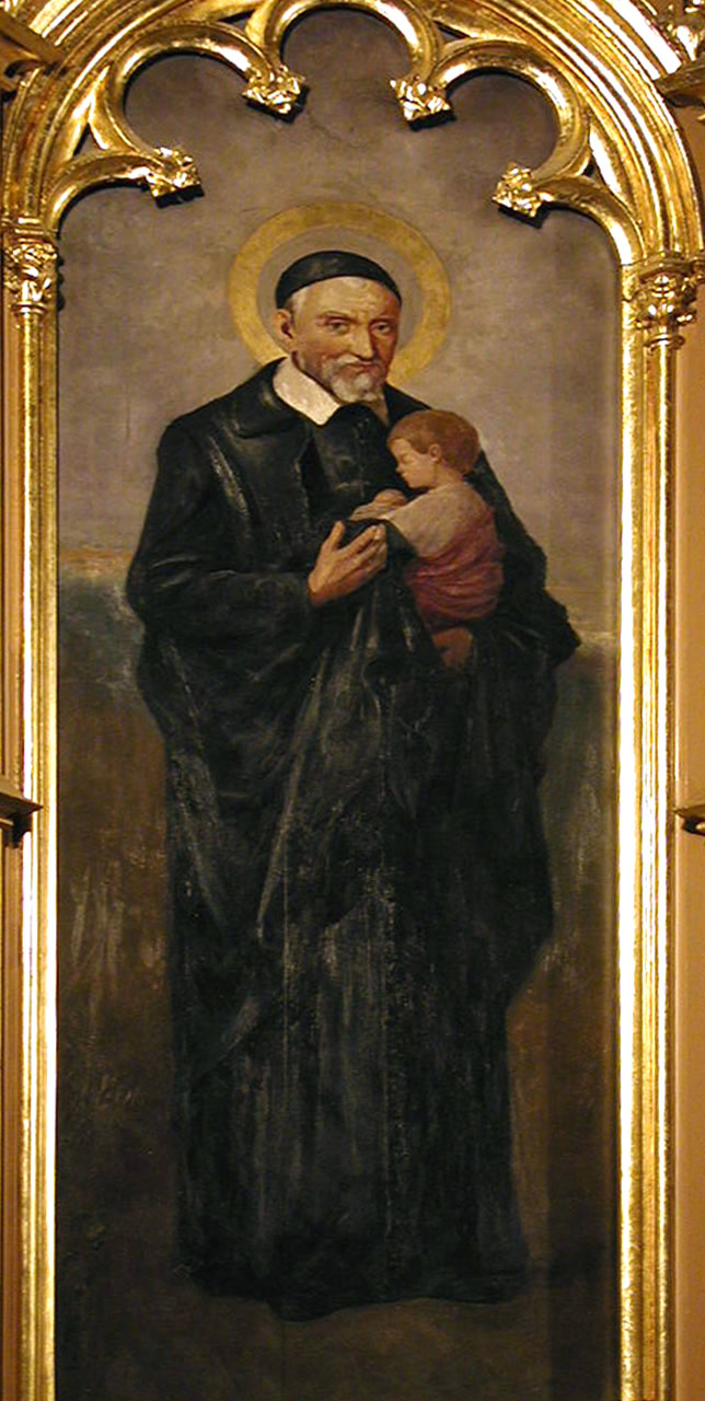 Oil painting, Gothic frame; Vincent de Paul, cassock, mantle, skullcap, gold halo; standing, holding child; original in hospital, Palma de Mallorca