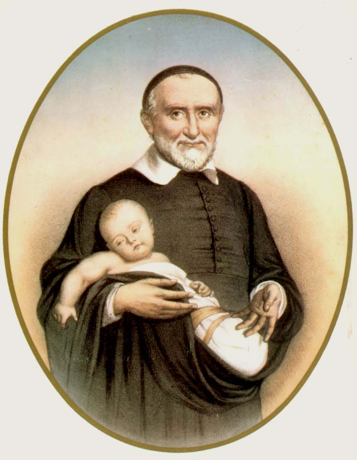Oval painting (engraving? print?); Vincent de Paul, standing, cassock, cape, skullcap; holding infant; Spanish; location of original unknown