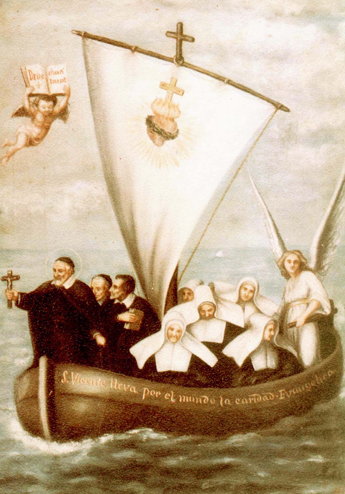 Oil on canvas; Vincent de Paul, standing, cassock, cape, skullcap, halo, holding crucifix; in prow of sailboat, angel at the helm; Sisters (Spanish habit) and priests on mission; Spanish text; artist: JM Perdigón H., original in S. Brigida, Las Palmas