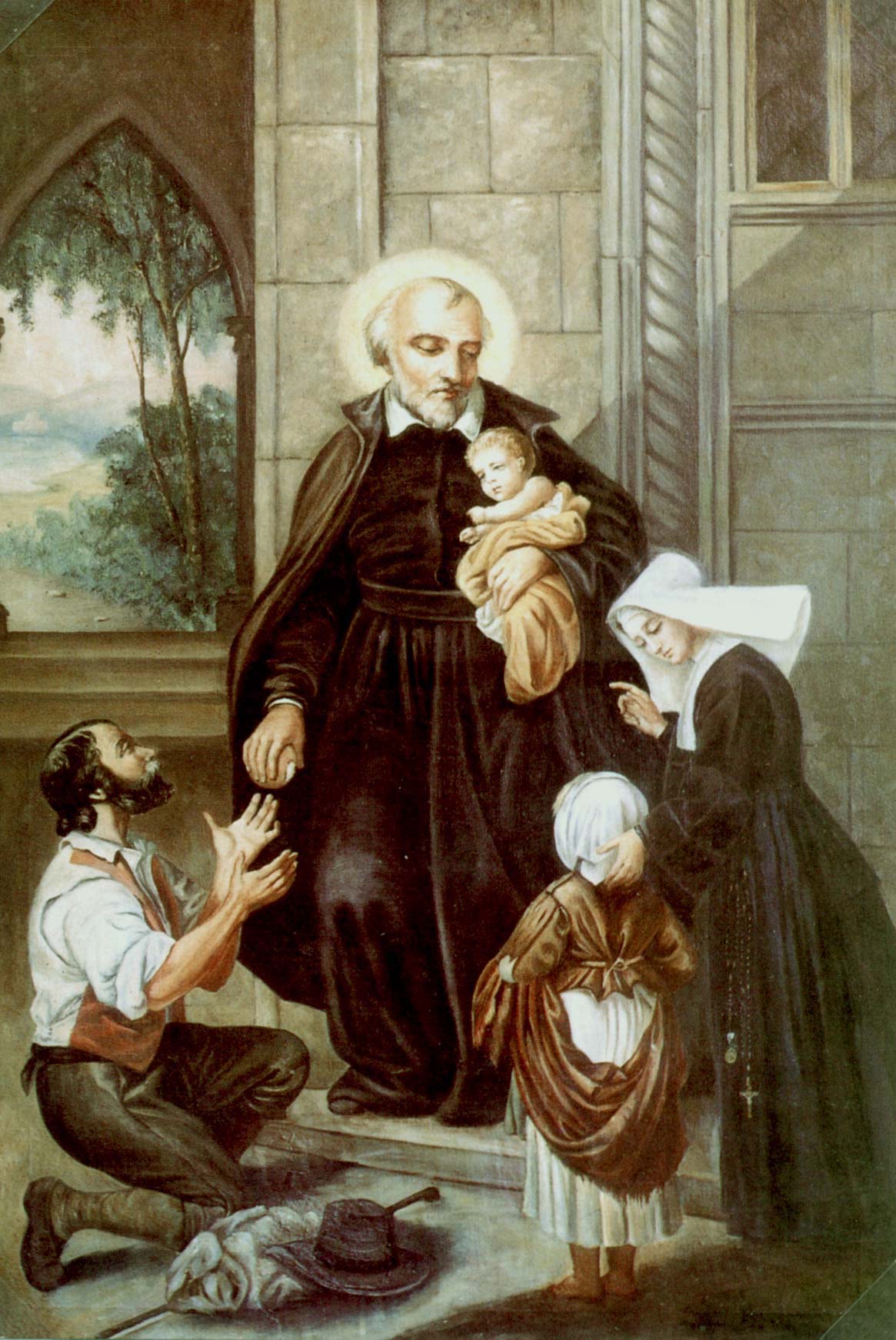 Oil on canvas; Vincent de Paul, standing, cassock, cape, halo, gives bread to poor man; holds infant; Daughter of Charity in Spanish habit with girl; original in Colegio, los Remedios, Santiago de Compostela