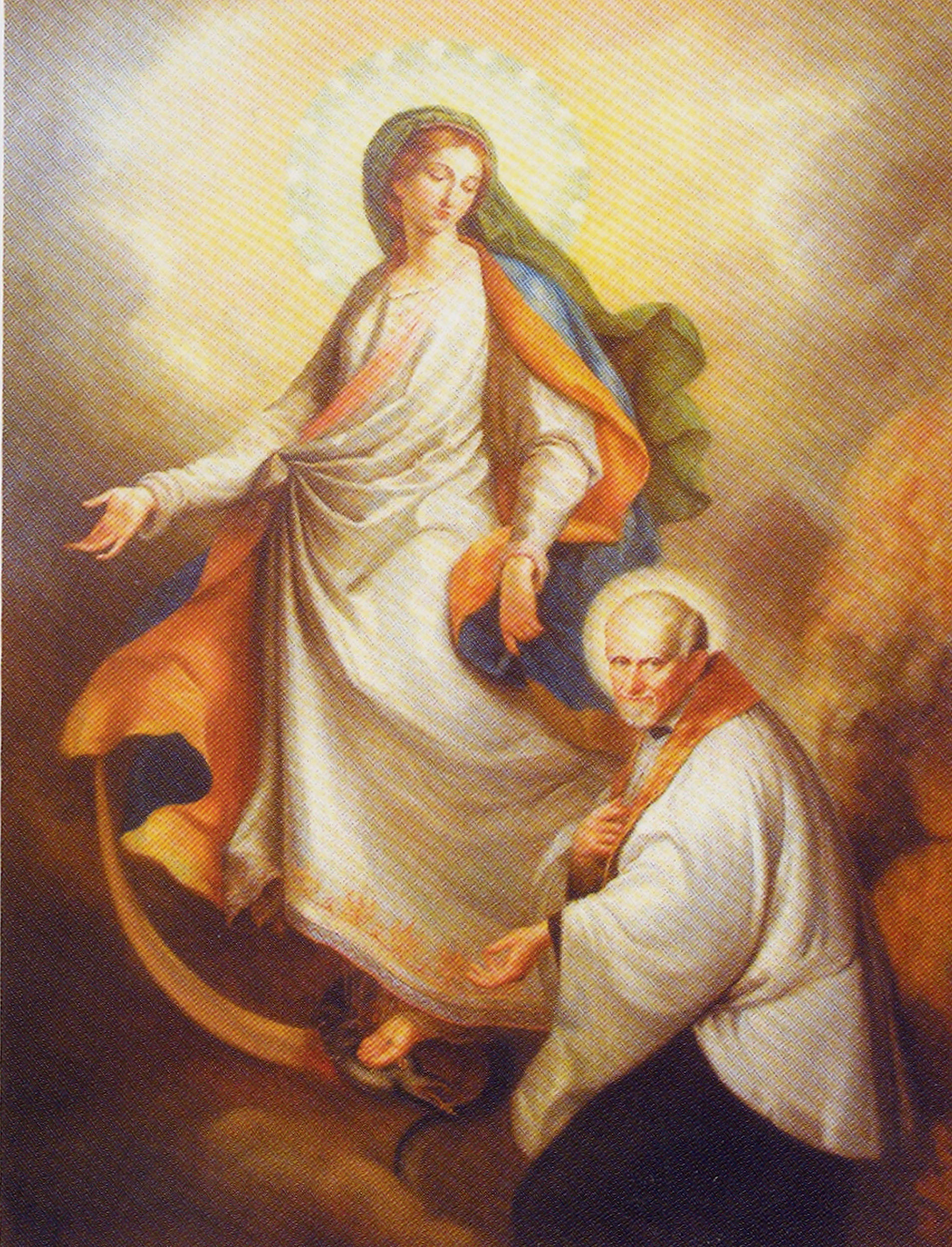 Vincent de Paul, cassock, surplice, halo; kneeling before Mary as Immaculate Conception; Original in Vincentian house, Carabanchel, Madrid; reproduced from Anales de la Mission, 115:2, 2007