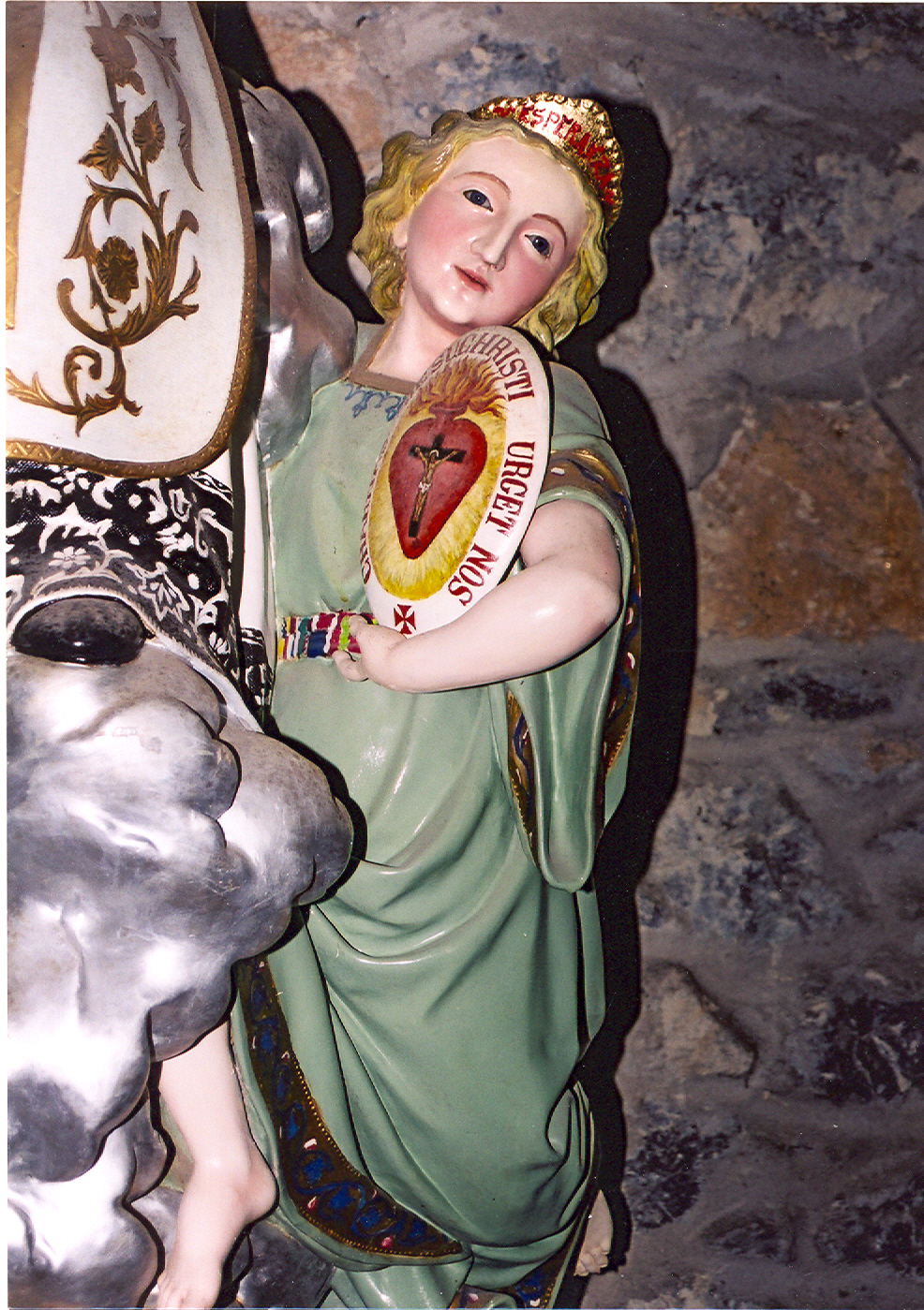 Vincent de Paul, escorted by Hope (Esperanza) angel, with Daughter of Charity emblem, dressed in green, color of hope; original in chapel, Limpias