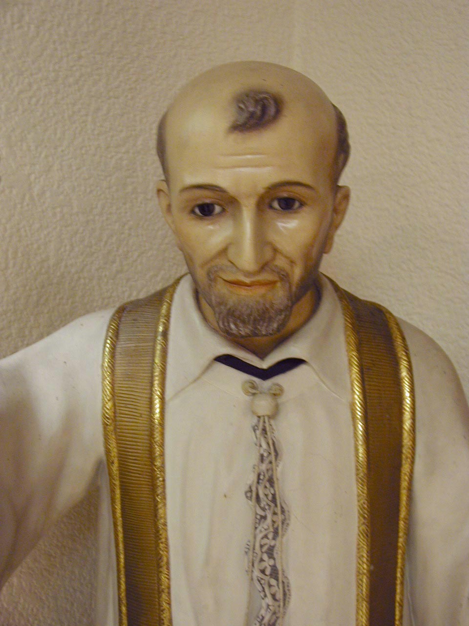 Painted plaster statue, Vincent de Paul, standing, cassock, surplice, gold stole, detail, original in Daughters of Charity provincial house museum, Zaragoza