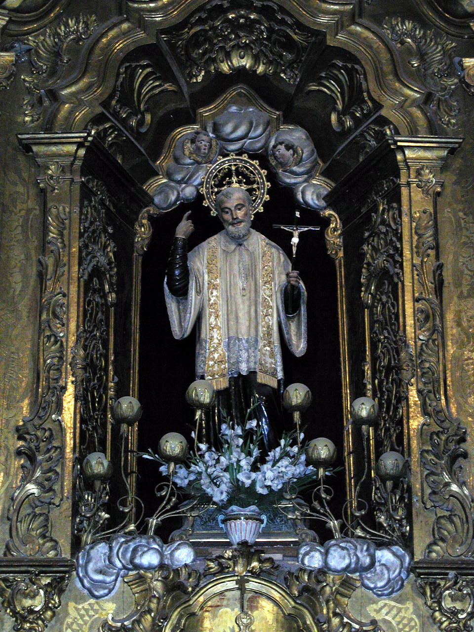 Painted and gilded statue; Vincent de Paul, grey hair and beard, standing, cassock, surplice, gilded stole, metal halo, holding cruciix; altar of Vincentian chapel, Palma de Mallorca