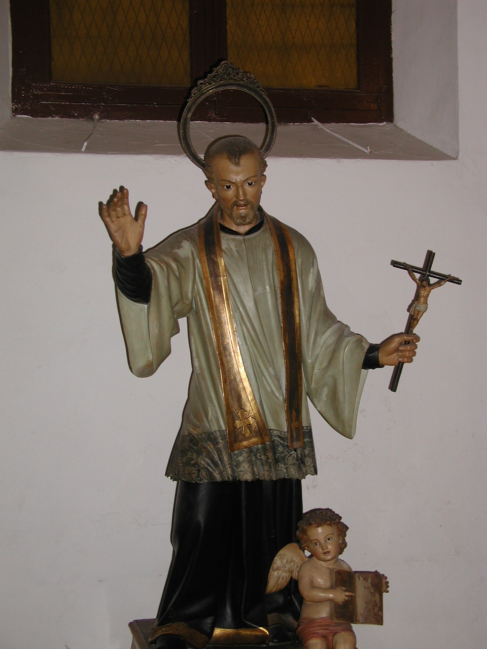 Painted statue; Vincent de Paul, standing, cassock, surplice, violet stole, halo, holding crucifix, hand raised; angel below pointing to book; original in Vincentian house, Palma