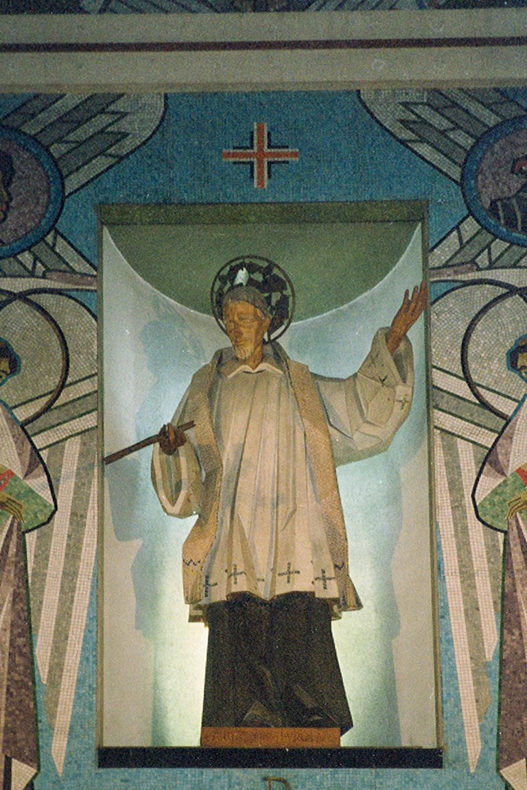 Painted statue, Vincent de Paul, standing in niche, cassock, surplice, white stole, skullcap, metal halo, holding crucifix in gesture of preaching; mosaic background; original in Vincentian parish, Seville