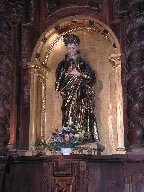 Painted and partially gilded statue; Vincent de Paul, standing, cassock, cape, metal halo, skullcap; altarpiece at Vincentian church, Villafranca del Bierzo