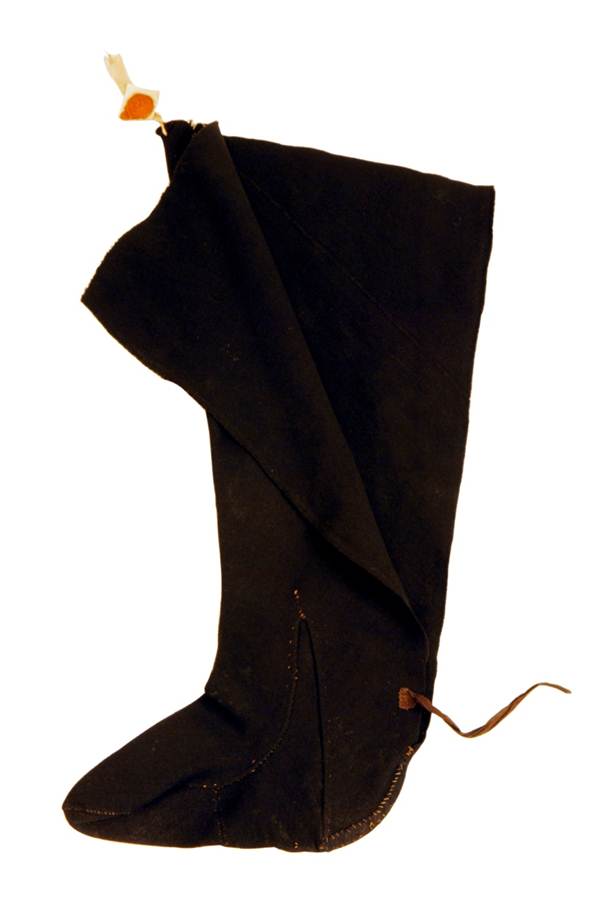 Cut open to accommodate swollen leg, tied with ribbons at ankle and mid-calf
