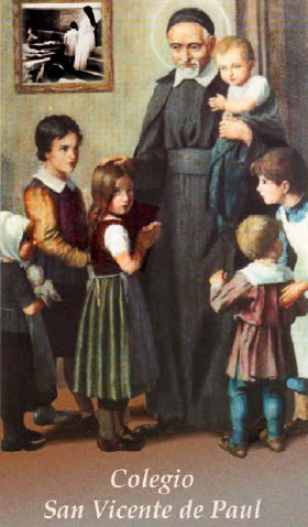 Vincent de Paul, children, painting of Daughters of Charity behind (missing in other version); Spanish text