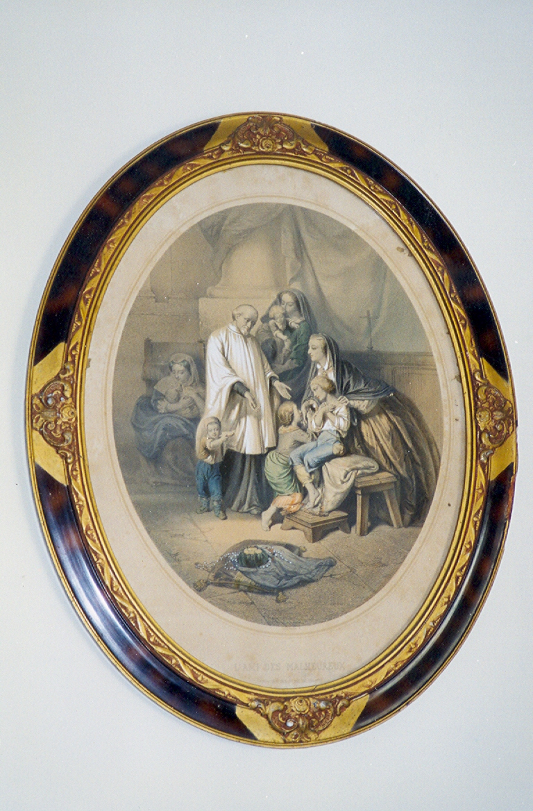 Framed oval colored lithograph; Vincent de Paul, standing, cassock, surplice, with poor persons; original in Vincentian house, Seville