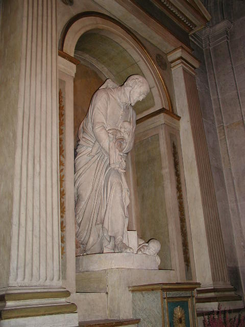 Marble, Vincent de Paul, standing, cassock, cape, holding infant, reaching for another on the group; copy of the original outdoor statue at SVdP hospital, Paris