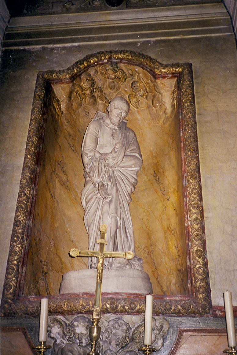 Marble; Vincent de Paul, standing, cassock, cape, skullcap, holding infant, reaching down to another; copy of original by Stouf