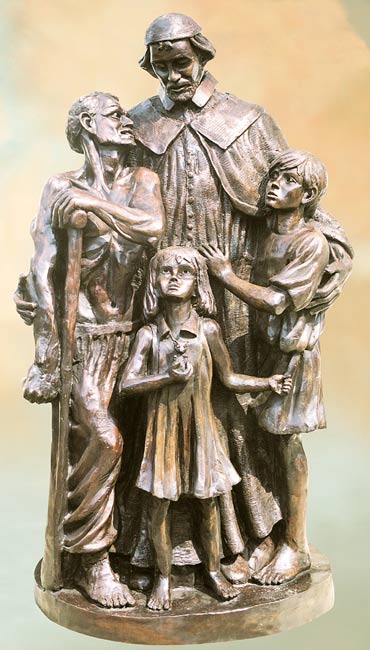Commercial photo, bronze, Vincent de Paul, standing, cassock, cape, skullcap, with poor; copyrighted