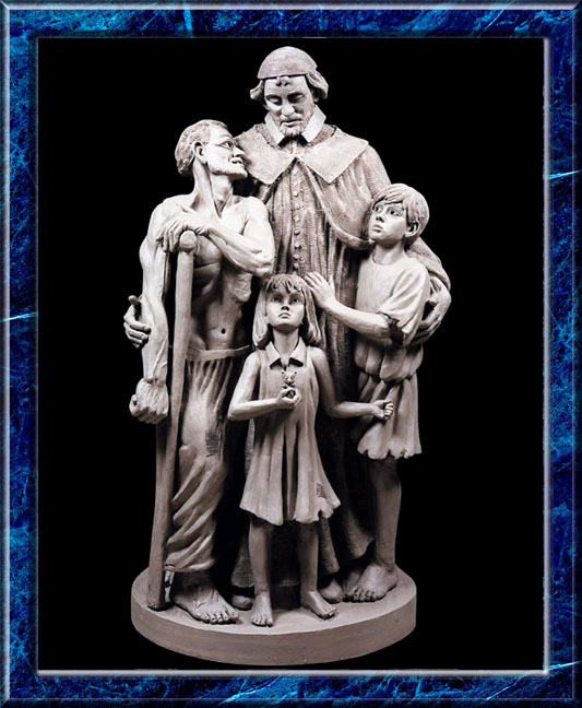 Commercial photo, Vincent de Paul, standing, cassock, cape, skullcap, sheltering three poor persons; copyrighted