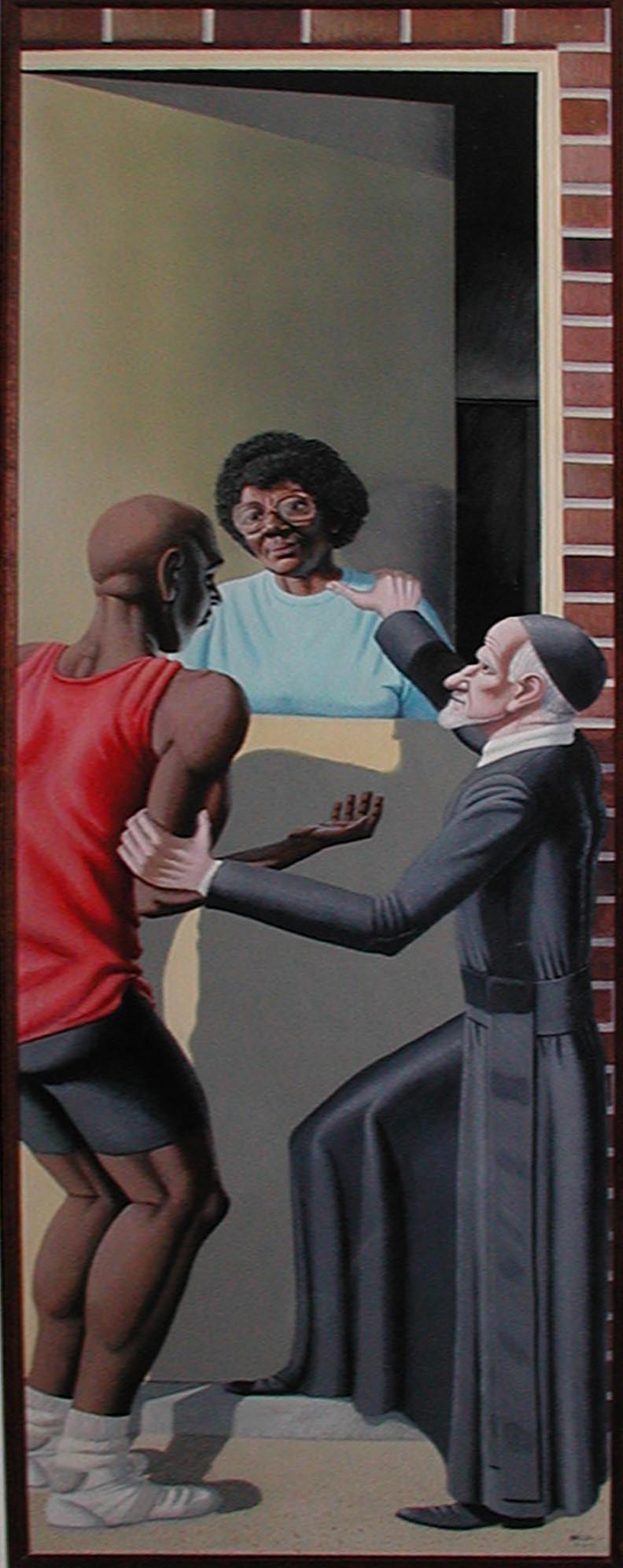 Oil painting; Vincent de Paul presents poor man to charitable woman, Rose Hollings, set in St. Louis. Study for an outdoor mural at St. Vincent's Church, St. Louis, by Bro. Mark Elder, C.M. Original moved to Earth City, MO.