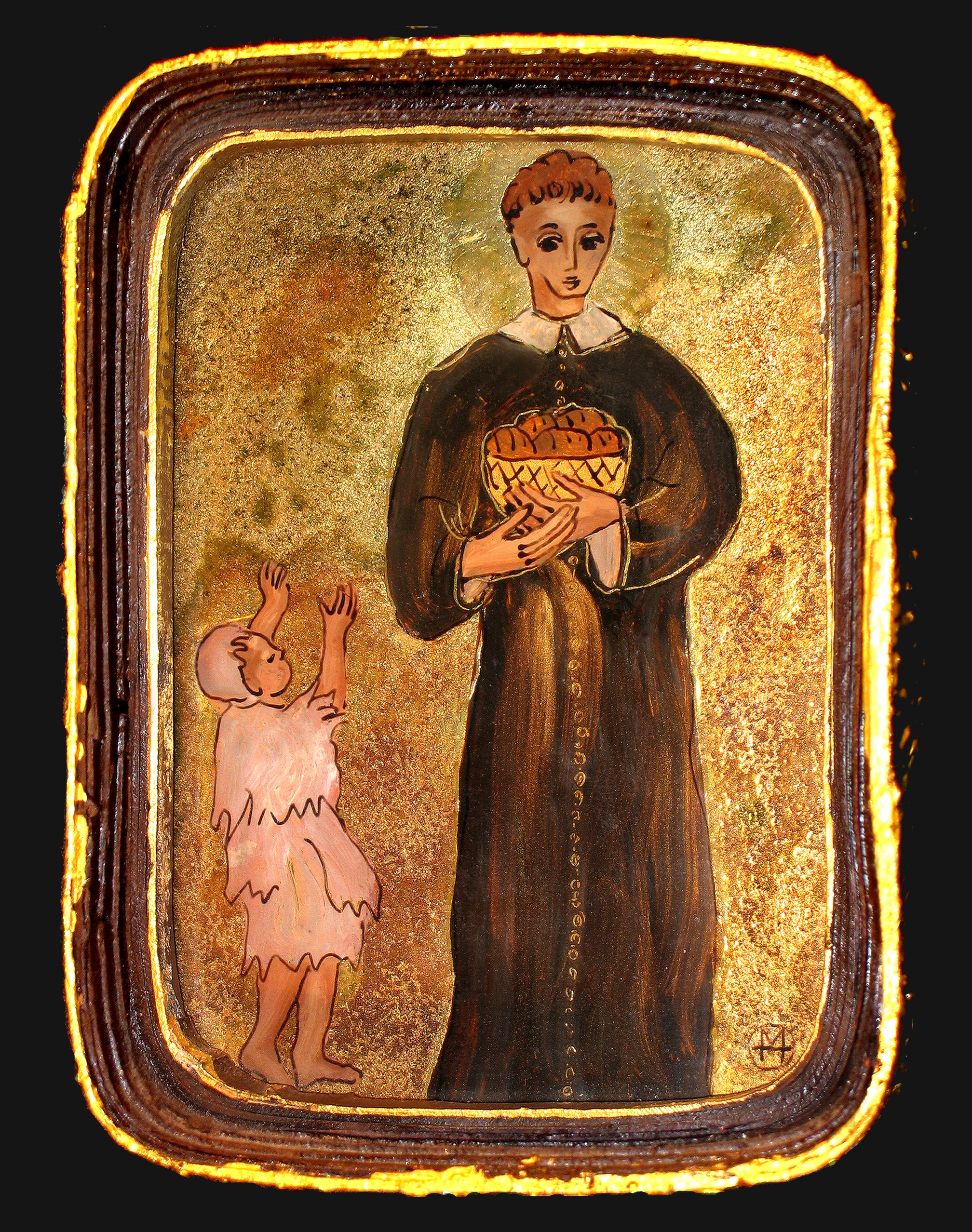 Framed painting on glass, gilding; Vincent de Paul with shoulder cape, holding bread basket; poor child at his side. Owned by E. Tomasiewicz, CM, DePaul University, Chicago; artist M. Hniedziewicz, 2006