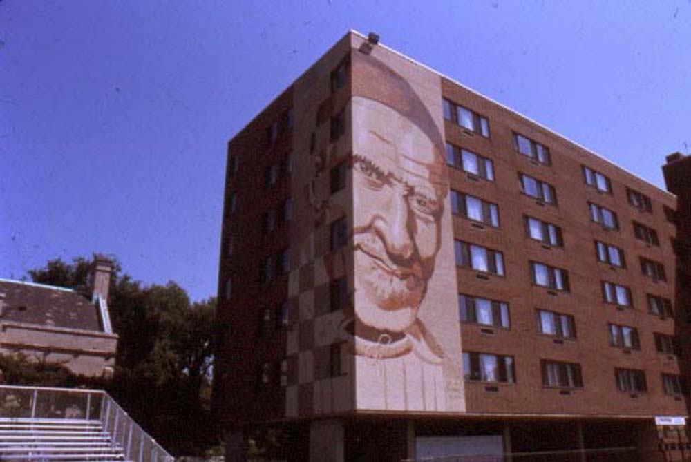 Outdoor mural; Vincent de Paul, composed of faces of DePaul students, faculty and others, who make up DePaul University; replaces 1999-2000 mural; finished 2001; artist, Mark Elder, CM with students