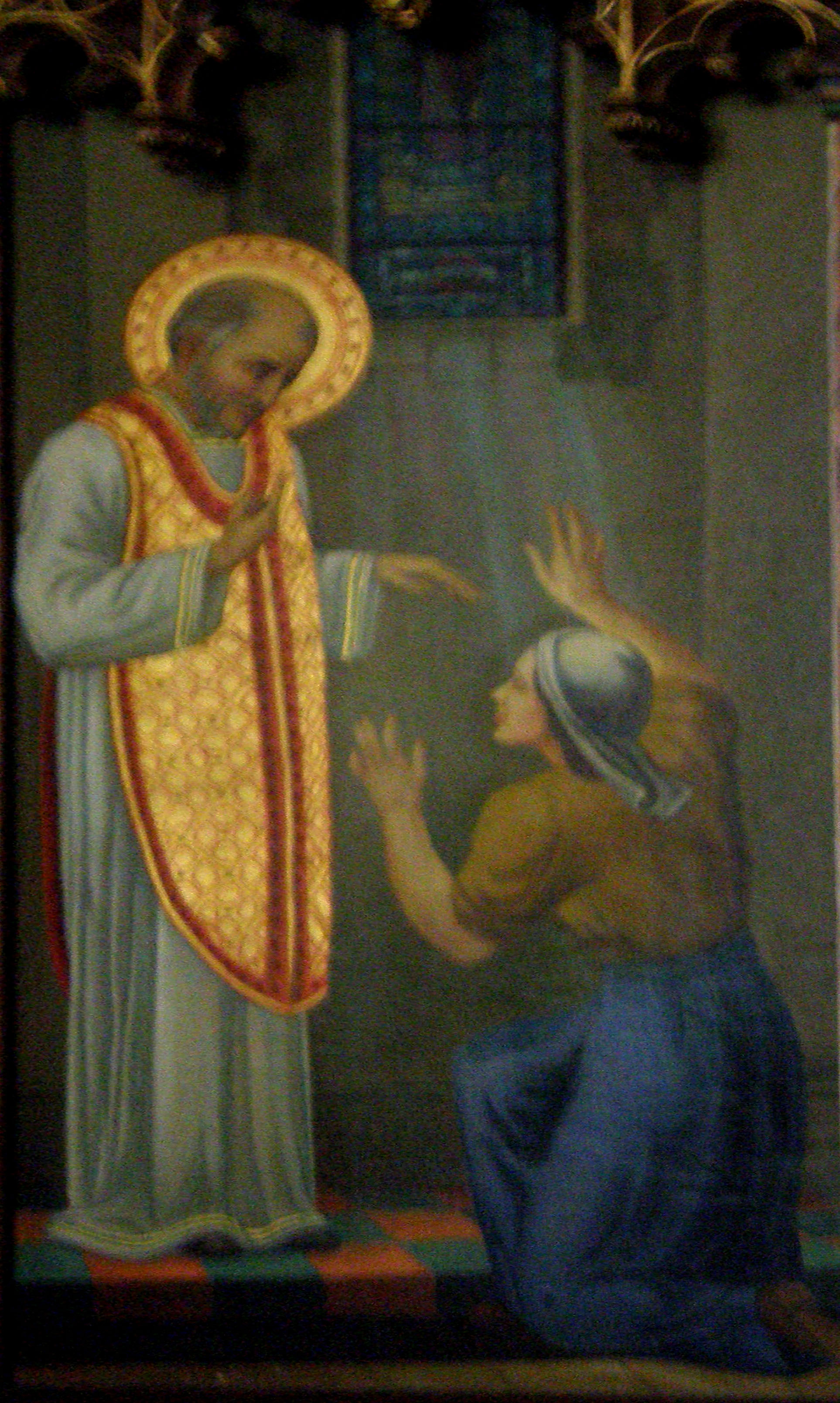 Painting on altarpiece; Vincent de Paul, standing, vested, halo; blesses Marguerite Naseau, pioneer Daughter of Charity; original in chapel, St. Joseph's Seminary, Princeton