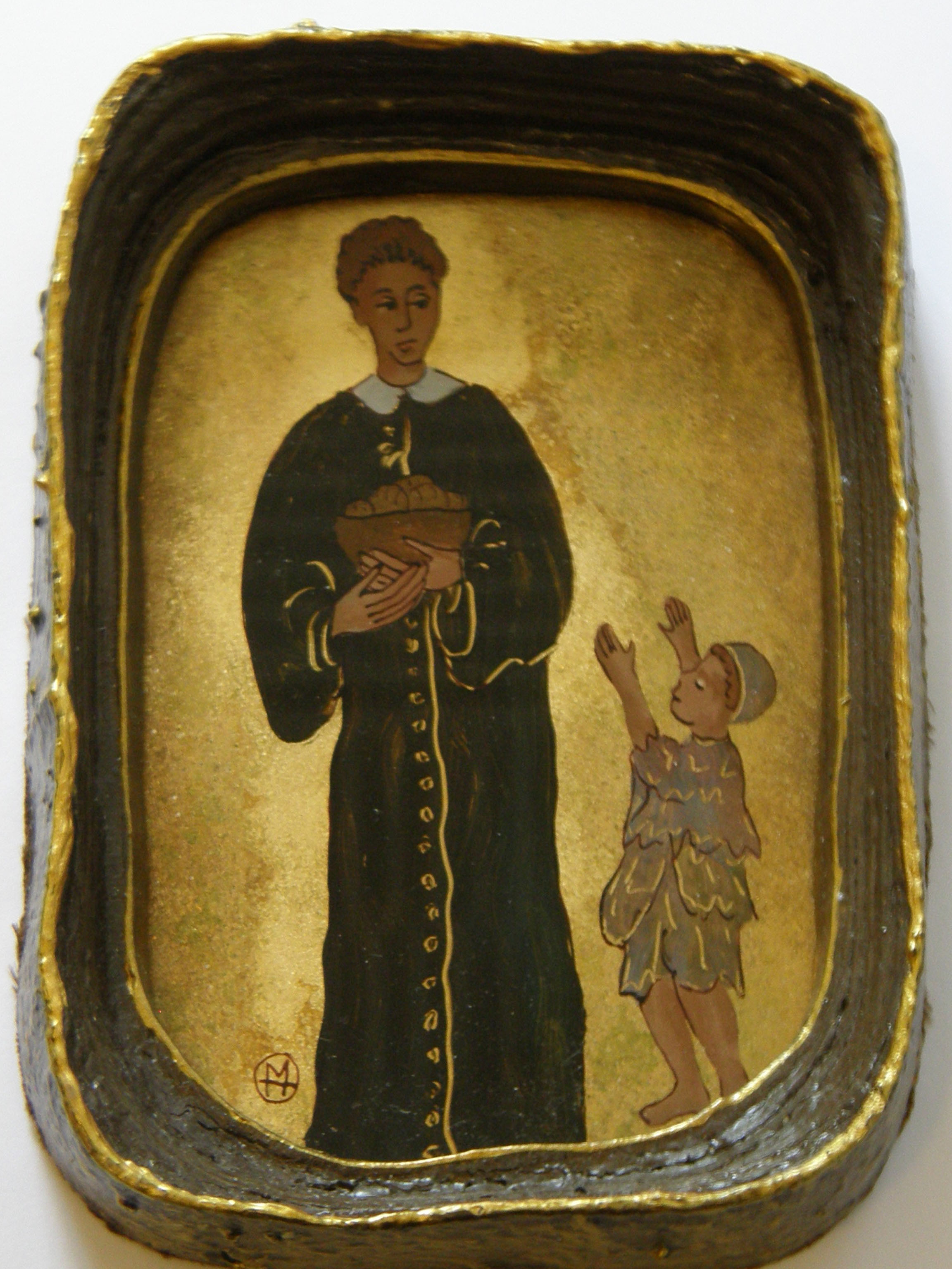 Framed painting on glass; Vincent de Paul, standing, cassock, light hair; holding bread basket; child with raised arms; owned by E. Tomasiewicz, CM, DePaul University, Chicago; second version