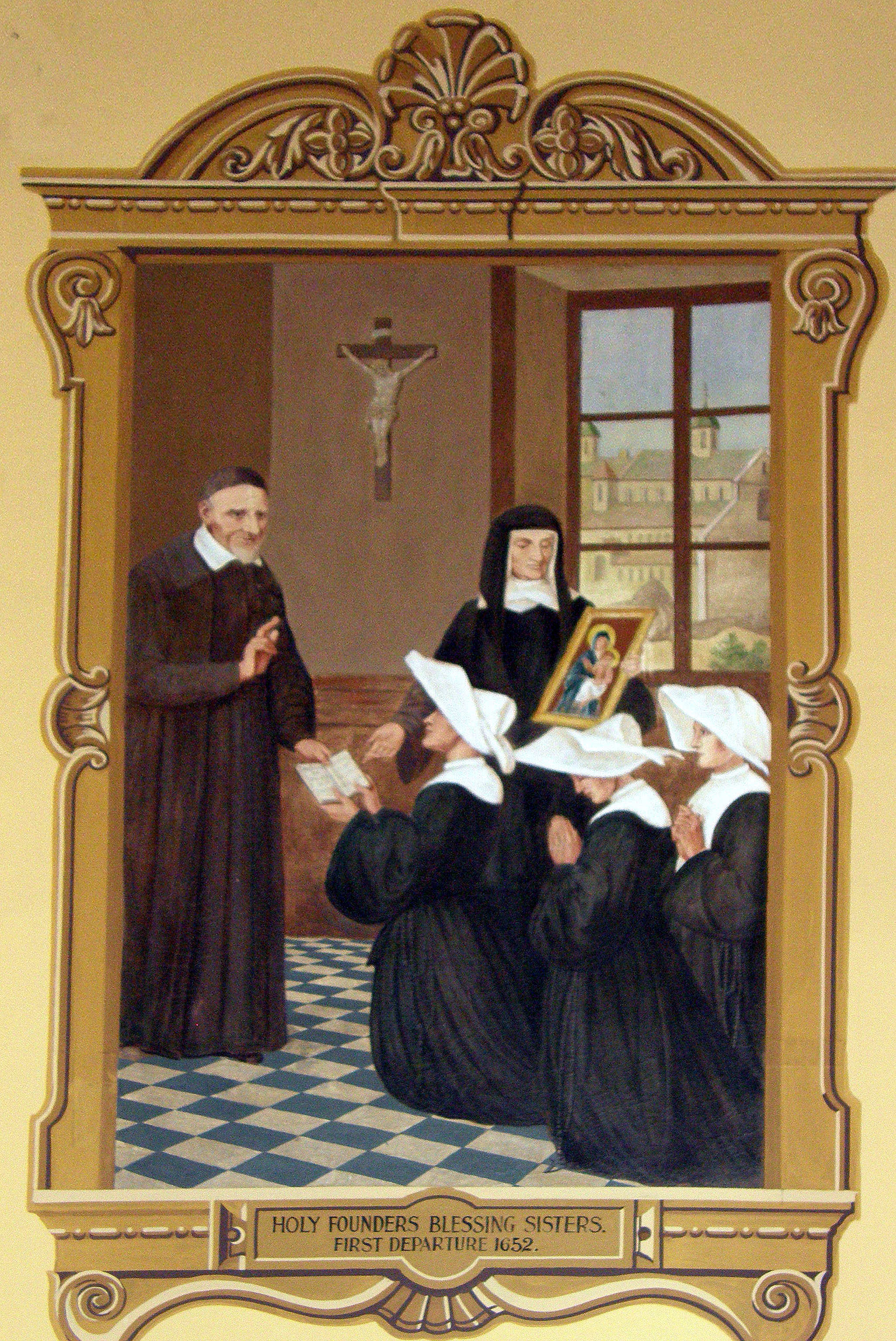 Mural painting, oil on canvas; Vincent de Paul, with Louise de Marillac, distributes Rules to kneeling Sisters in contemporary grey habit; St. Lazare chapel seen through window; original in Church of the Assumption, Perryville
