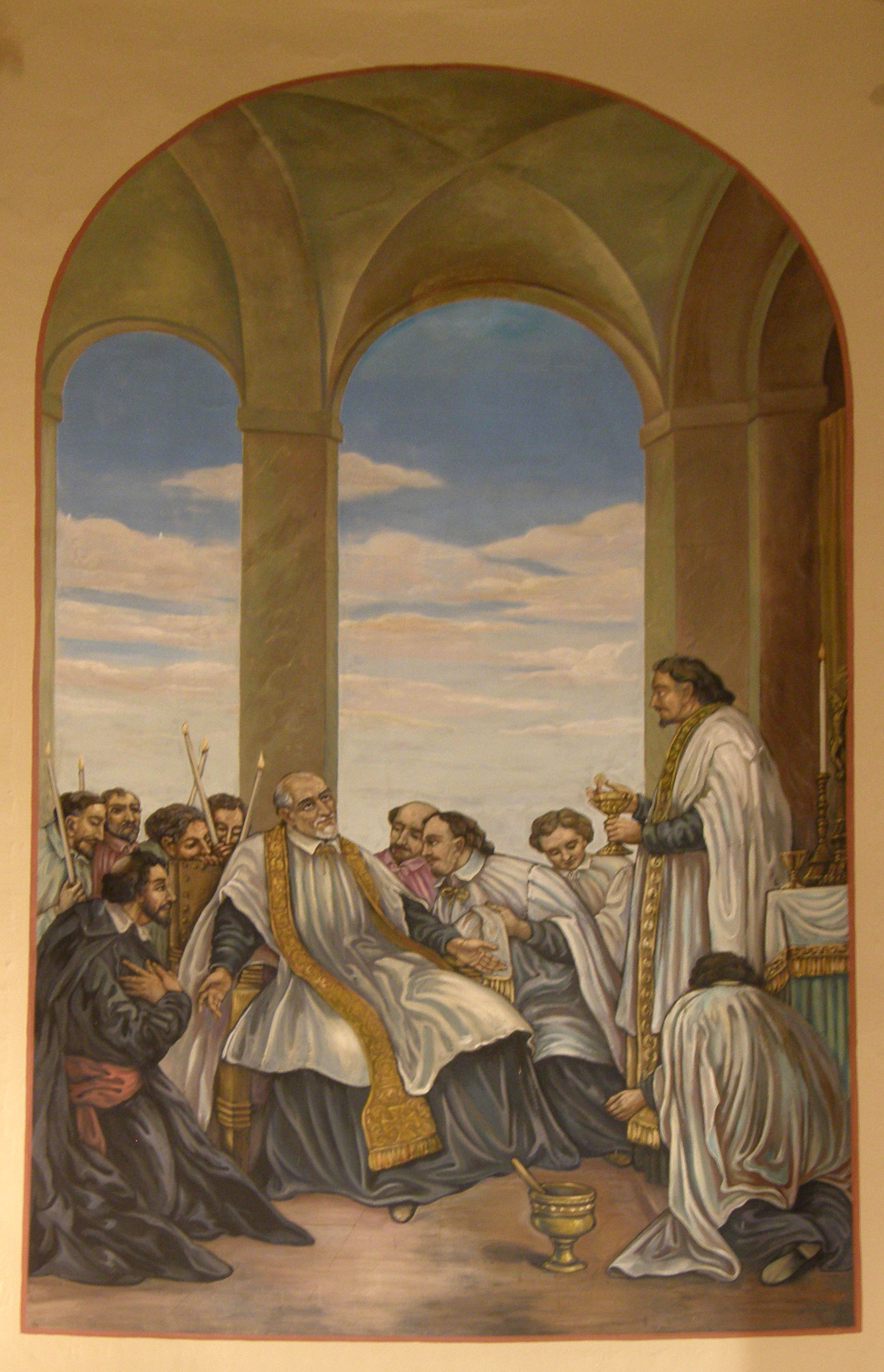 Mural painting; Vincent de Paul, seated, cassock, surplice, gold stole; receiving viaticum; surrounded by priests; original in St. Vincent's church, St. Louis