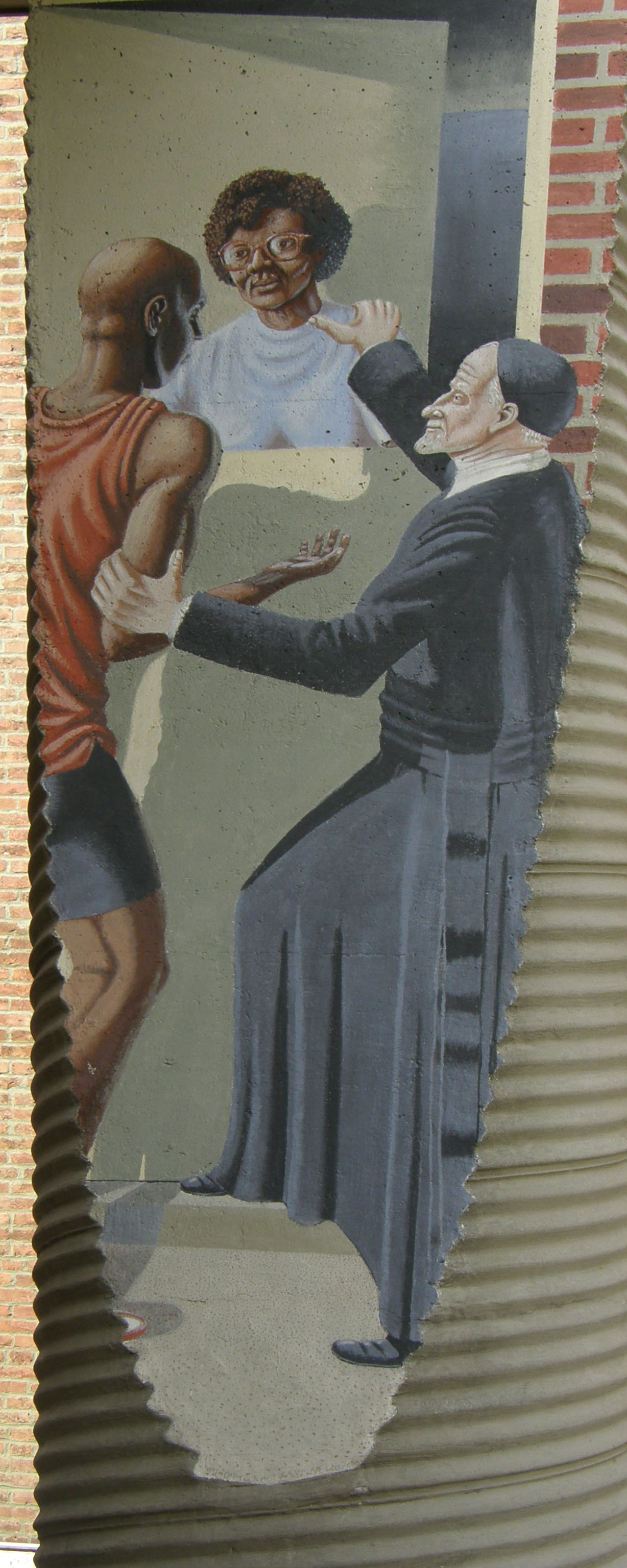 Outdoor mural on column; Vincent de Paul, standing, cassock, cincture, skullcap; presenting poor man to charitable housekeeper, Rose Hollings; maquette in Denver; artist, Mark Elder, CM; original at St. Vincent's church, St. Louis