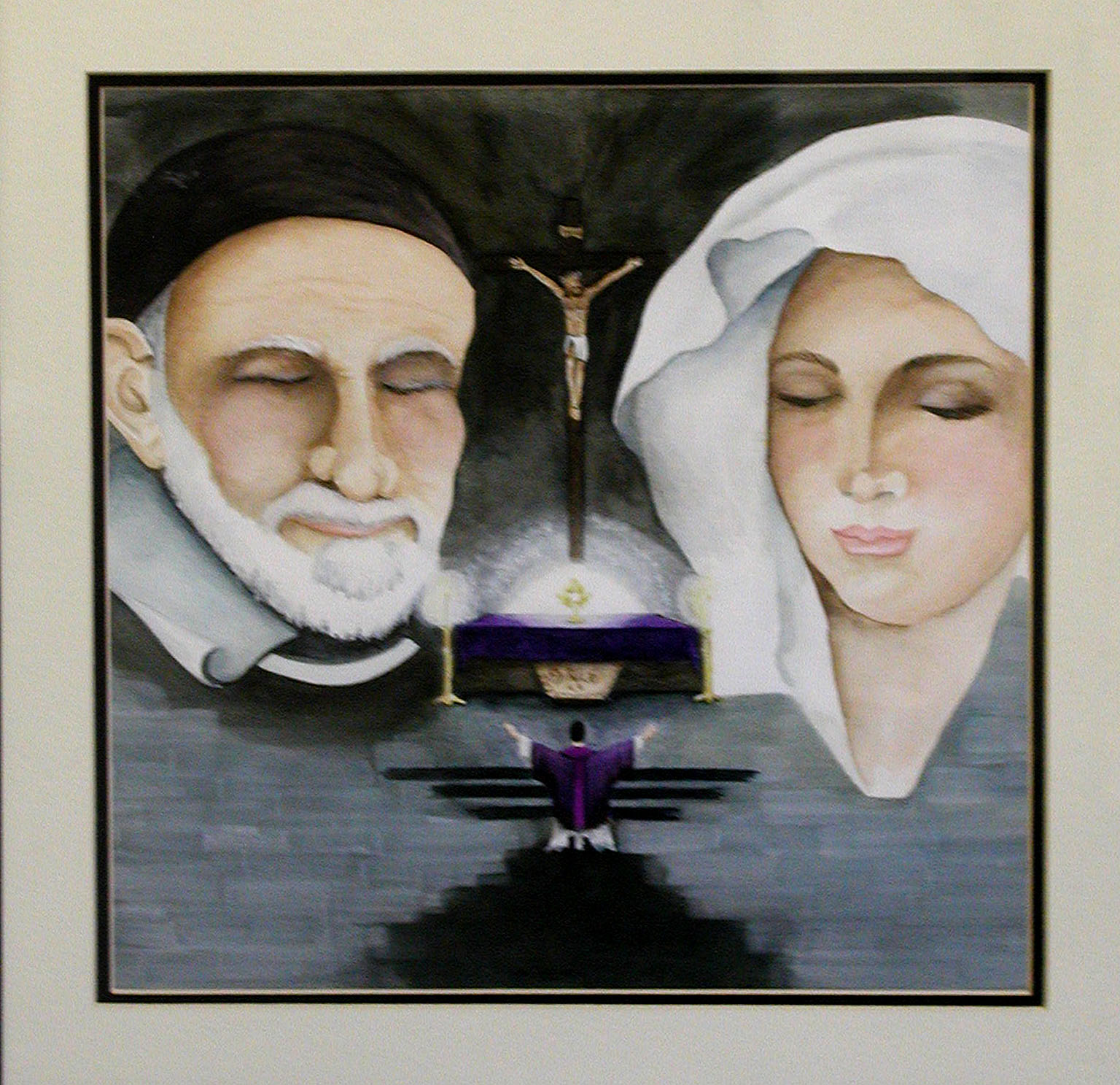 Priest in violet vestments kneeling before altar; heads of Vincent de Paul and Louise de Marillac; original at St. Vincent parish, St. Louis