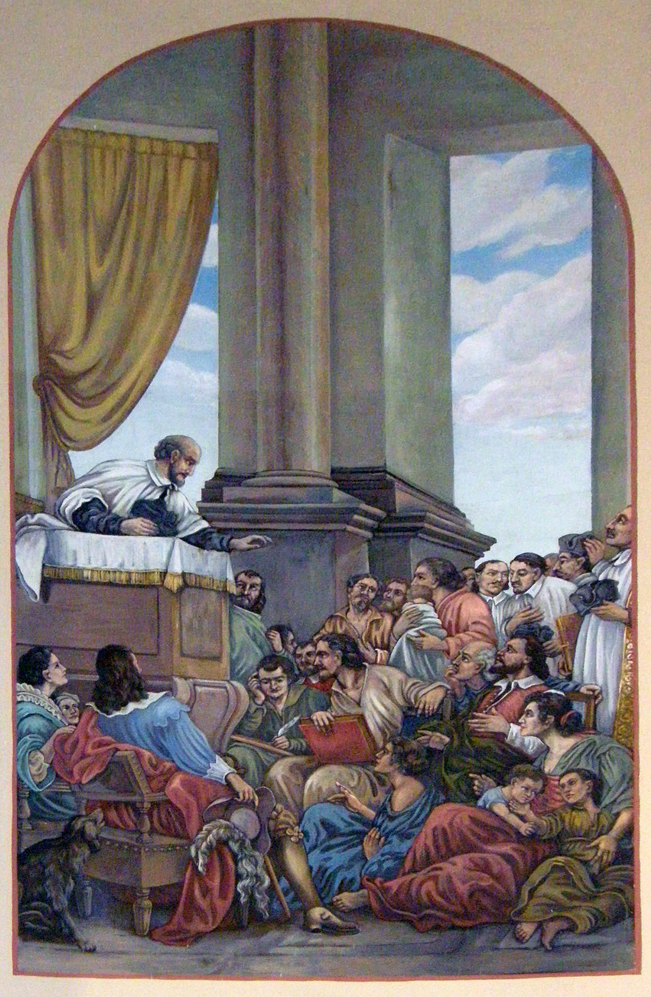 Mural painting; Vincent de Paul, seated in pulpit, cassock, surplice, biretta; people sitting and standing; based on original beatification painting in Macon; original in St. Vincent's church, St. Louis