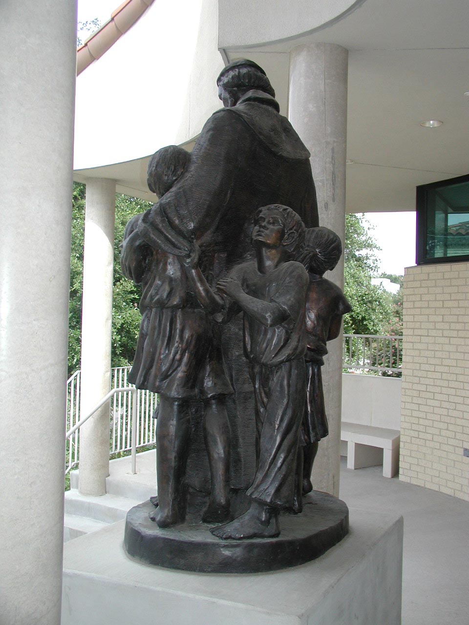 Bronze statue, Vincent de Paul and poor persons; side, rear view. Original in Dallas