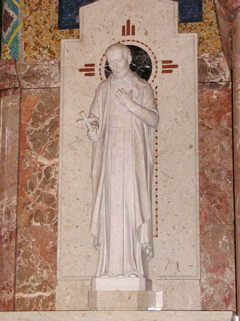 Marble, altarpiece; Vincent de Paul, standing, cassock, mantle, skullcap, contemplating crucifix; original in Emmitsburg, MD