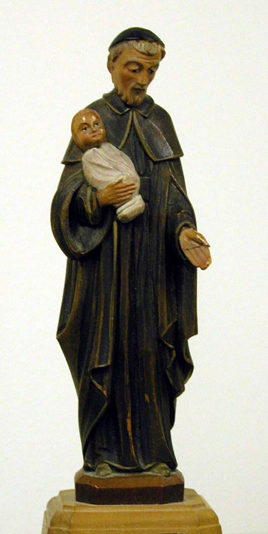 Vincent de Paul holding infant; wooden statue; original in Vincentian house, West Hartford, CT