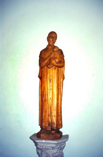 Carved wooden statue, Vincent de Paul, in cassock and short cape, holding infant. Original in Vincentian house, Denver